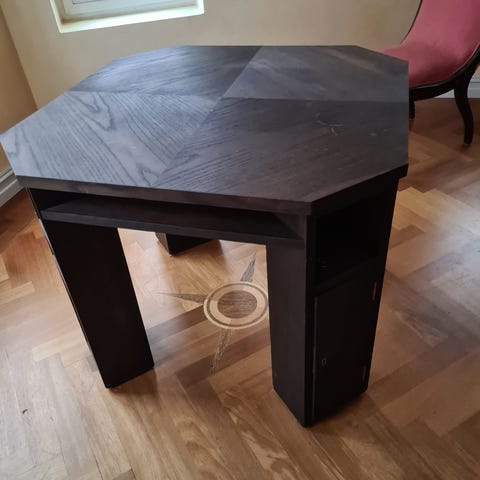 Bordplaten kan tas av, og bordet brukes uten spillflaten. Den kan også snus, og har felt på undersiden, samt at det har en spake under, som løfter bordplaten, og inni er det et "skjult rom" med backgammon og plass til oppbevaring.
