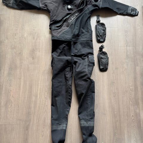 Waterproof Drysuit dykkerdrakt i svart farge. Drakten har integrerte støvler og mansjetter, samt ventiler for trykkutligning. Egnet for dykking i kaldt vann.