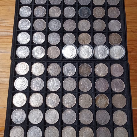 amerikansk sølvmynt, Morgan Dollar, 1882-O, Peace Dollar, sølvdollar, USA mynt, samlermynter, sølv