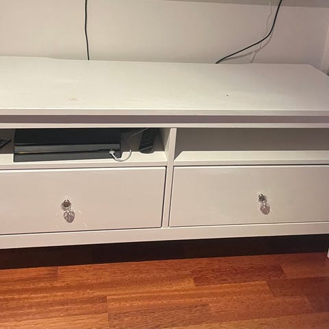 Den har et stilrent design med god plass til oppbevaring av elektronikk, spillkonsoller, bøker eller dekor. Benken har både åpne hyller og lukkede skap/skuffer for et ryddig uttrykk.