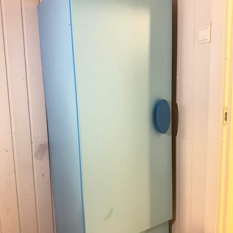 Skapet har blitt brukt på et barnerom. Med fire dører er det lett for barnet å nå den nederste delen av skapet, der det er god plass til leker, klær og sko.