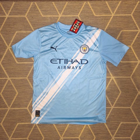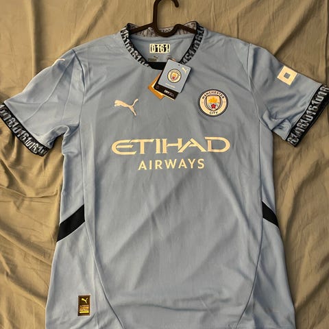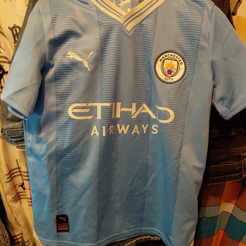 Puma Manchester City fotballdrakt med Haaland 9 på ryggen. Drakten er lyseblå med logoer for Manchester City og Etihad Airways. Den har Premier League-merke på ermet og er laget for fotballspillere. Str XS