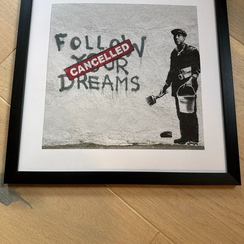 Selger to dekorative Banksy-inspirerte bilder samlet. Motivene er blant de mest kjente innen moderne street art og passer godt i moderne hjem, kontor eller ungdomsrom.