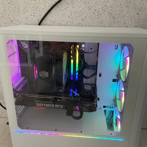 Acer stasjonær PC med svart kabinett og LED-belysning. Utstyrt med kjølesystem med vifter, interne komponenter synlige gjennom sidepanel. Ddr5 skjermkort.