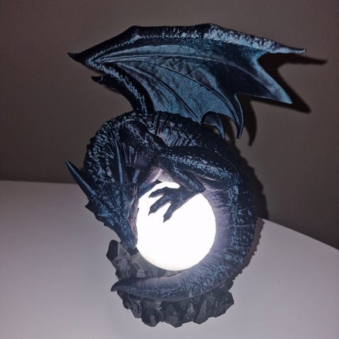En fantastisk og detaljert drageformet lampe, 3D-printet i et spesielt materiale som gir den unike farger. På nært hold ser den virkelig fantastisk ut. Lampen er omtrent 26 cm høy og fungerer perfekt som en attraktiv dekorasjon i hjemmet eller på kontoret. Den bruker en standard 5V USB-telefonlader og har forskjellige fargevarianter du kan velge mellom.