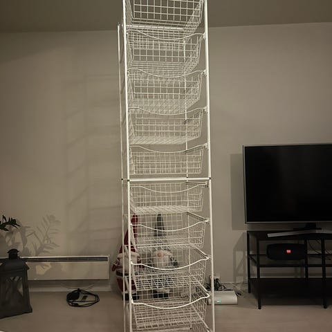 Selger 2 styk Norscan trådkurvstativ 205 x 55 x 50 cm (1 stativ hvit og 1 stativ grått) + 2 fester for stang hvit, trådhylle ca. 1,3 m lengde hvit og 2 x 1 m garderobestenger hvit.