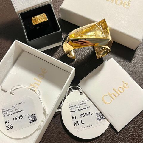 Gullfarget armbånd fra Christian Dior med amuletter av hans ikoniske parfymeflasker: Poison, Dune, Dolce Vita, Tendre Poison og Miss Dior. Lengden er 21,5 cm og kan justeres ned etter ønske. Amulettene er ca 2,5 x 2 cm. Flott også oppå hansken. Selges uten eske.