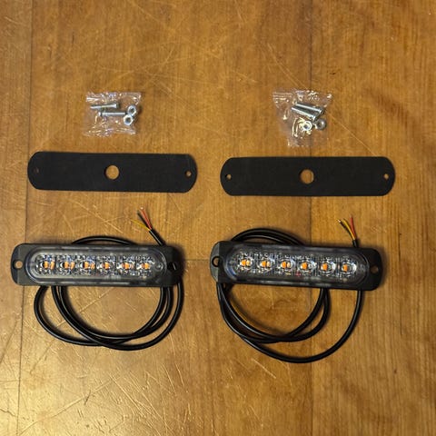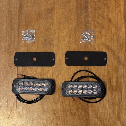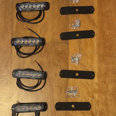 4 stk. Helt nye og ubrukte 12-24 volt LED varsellys, med gult blinkende lys. Monteringsunderlag og skruer følger med. Enkel montering med rød ledning til pluss, sort ledning til minus, og gul ledning for å velge blinkmønster ( Kort berøring til pluss for neste mønster.).