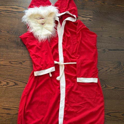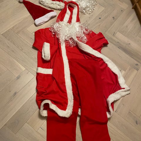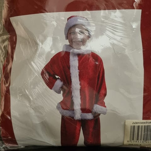 Julenissedrakt rød drakt med hvite detaljer, rød lue med hvit dusk, hvitt skjegg og rød pose med teksten 'God Jul'.