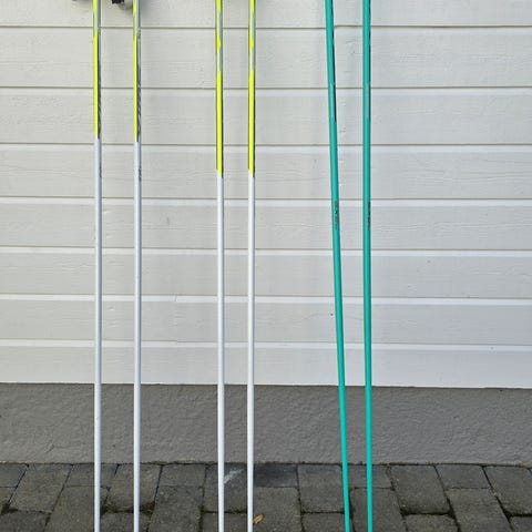 Stavene er knapt brukt. Staven er merket 145, men er tilpasset en utøver på 172 cm, dvs 142cm.