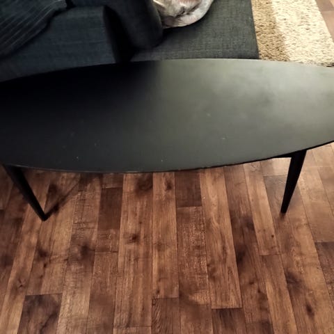 Svart salongbord i enkel og tidløs stil. Bordet er brukt og har noen små hakker/slitasje på bordplaten, men fremstår fortsatt fint og gjør seg godt i stua. Ingenting som påvirker bruken.