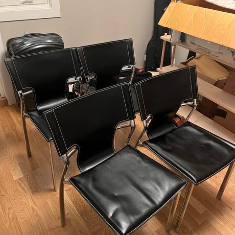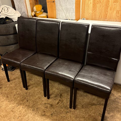solid og slitesterk skinn stoler Bakkely merke, som ny uten noe skadet. selges billig. første mann til mølla. 300 stk selges helst samlet.