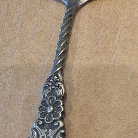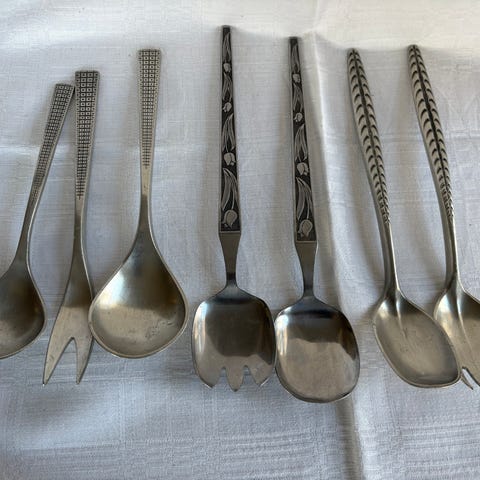 Selger samlet et par tinn serverings deler. Ett kjøtt gaffel og ett stort serverings skje i veldig godt vintage stand med en tidløs mønster på håndtakene.