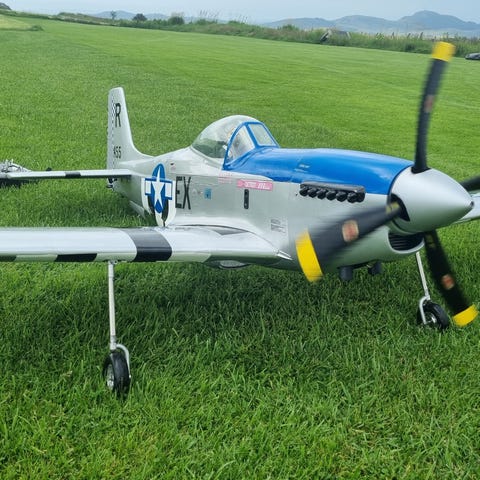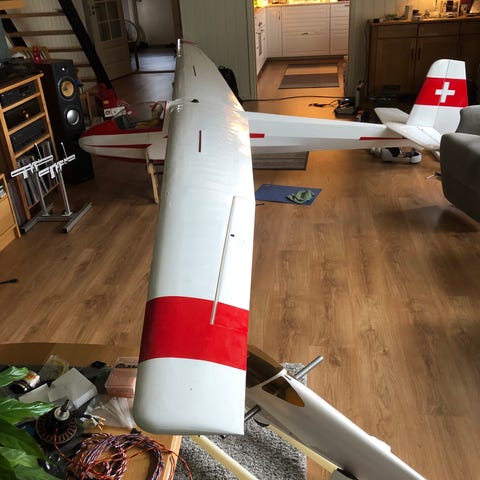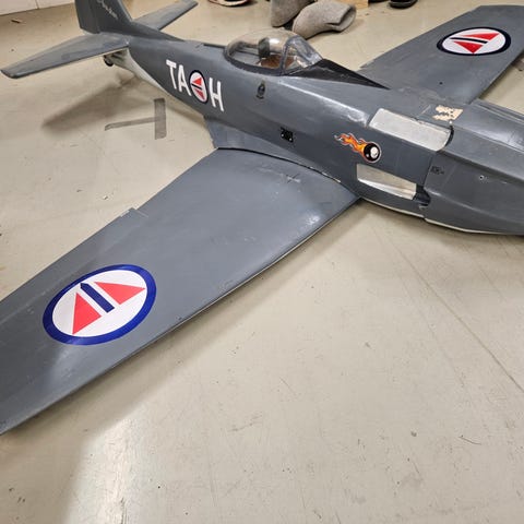 Strøken Thunderbolt t.s. Total flytid er kun ca 20 min !!! V. spenn 202 cm. Nye ikke monterte Electron ER-40 retracts/kontrollboks følger med. Det er også retract på halehjulet. Digitale DS-8180 MG-servoer. Selges u/motor.