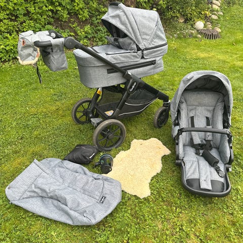 Mye originalt ekstrautstyr medfølger: Insektsnett, regntrekk, parasoll og to kroker til veske/handleposer (fra Tinkafu).