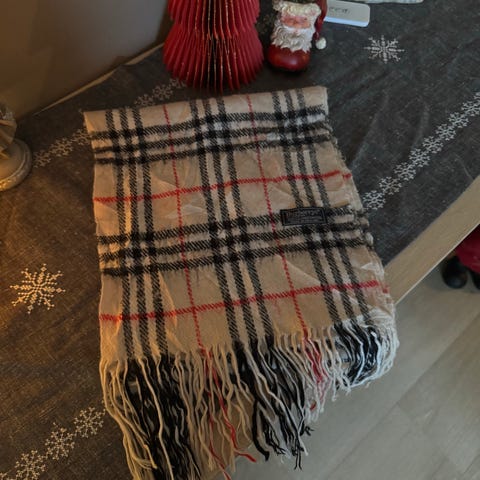 Pent Burberry skjerf i ull selges. Oppdaget dessverre et par små hull i det, men de synes ikke ved bruk.