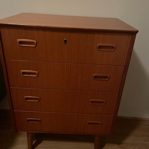 Fin retro teak kommode. 3 skuffer med lås og nøkkel på den øverste skuffen. Kan hentes i Øyer eller på Manglerud i Oslo. Frakt til Oslo 100 kr.
