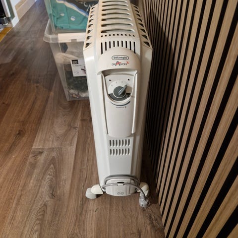 Kjempebra DeLonghi Capsule Fan Heater selges billig i stand på bilder. Den varmer opp kjempebra.