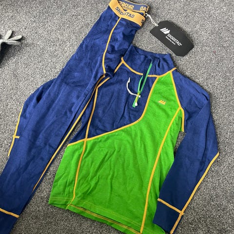 i størrelse 140 (8år), farge blå, laget av merinoull.