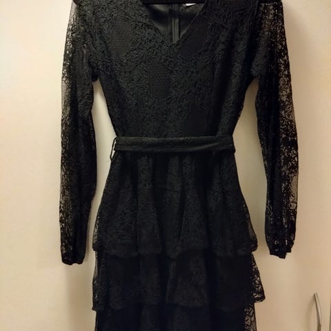 Lindex kjole til spesiell anledning i blå silke, størrelse S. Jeg er M, så den kan passe. Kjolen har et glatt og glansfullt materiale,