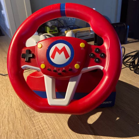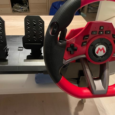 Nintendo Mario Kart Racing Wheel med pedaler i rød og svart farge. Inkluderer ratt med flere knapper og to pedaler for gass og brems. Utstyrt med festeanordning for stabil montering. Egnet for bruk med spill som støtter rattkontroller, men kontrol innstillingene må endres for bilspill utenom mariokart.