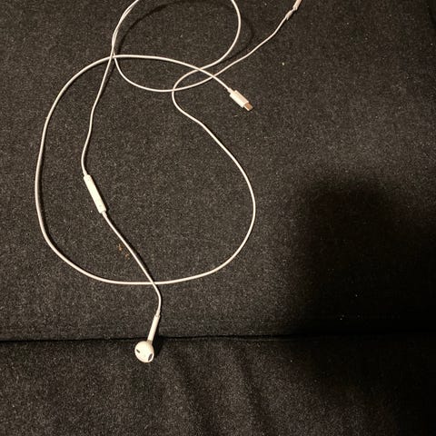 Apple headset med kablet tilkobling og 3,5 mm jackplugg.