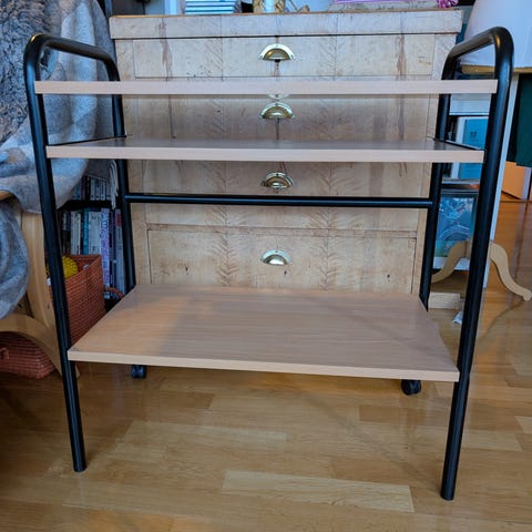 Praktisk nattbord - lett å rengjøre, enkelt å flytte, tåler varm mobil som lades, og sigarett som faller ut av askebegeret ...