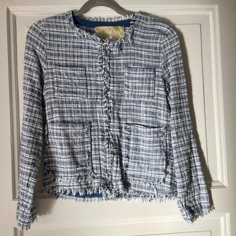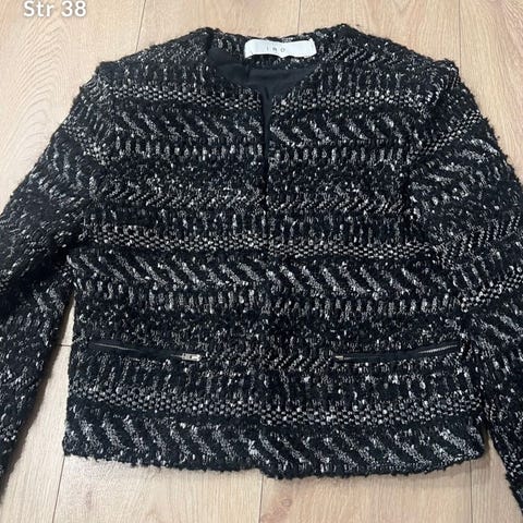 Isabel Marant jakke i fargen lys med beige undertråd og sorte islett, laget av ullblanding. Se lappen. Passer til dame og har størrelse 42. Jakken har knappelukking og lommer foran. Definerte skuldre m litt puff. Mykt vevet tweed. Litt oversized look for str 38, passer 40,42, 44. Hentes helst på Nordstrand / Bislett/ Lillestrøm