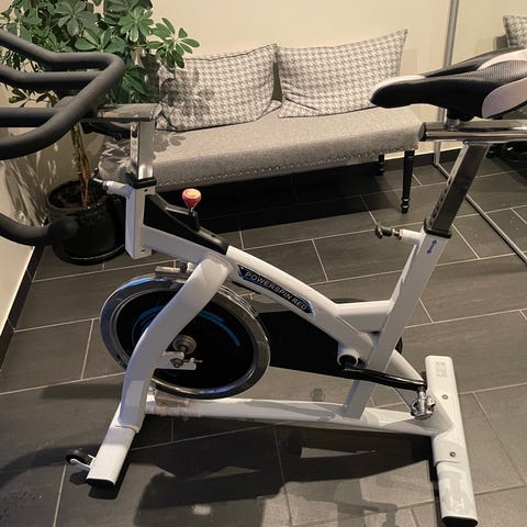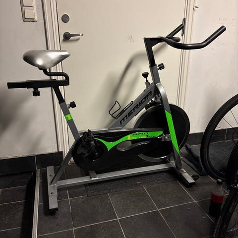 Merida Spinning sykkel med justerbart sete og styr for trening innendørs. Sykkelen har en solid ramme og mekanisk brems for motstandskontroll.