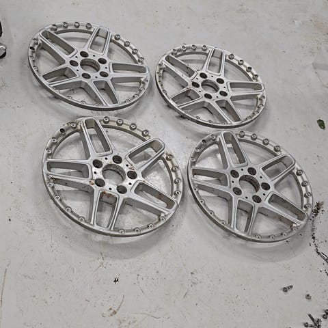 RH X-Rad 19x9 og 19x11 Radinox-kanter. bak felgene er i go stand men fram felgene trenger lit kjærlighet dekkene er også dårlige fram og bak. X-Rad er en av de mer ettertraktede RH-modellene, kjent fra eldre BMW-prosjekter og AC Schnitzer-inspirert design.