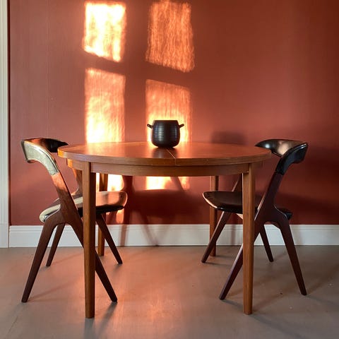 Solid rundt spisebord i teak med to ileggsplater. I god stand, men med noen synlige riper i overflaten. Solid håndtverk, fra 1970.