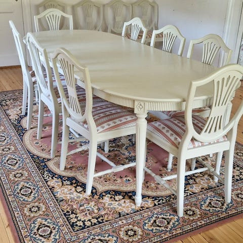 Godt brukt gustaviansk spisestue med to ileggsplater og seks stoler selges. Spisestuen bærer preg av at den er brukt, men mye bruk igjen. Stolputene ble trukket om for en del år siden, de er fortsatt veldig pene.