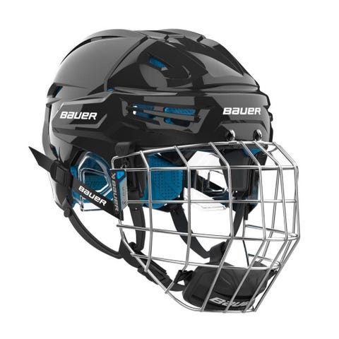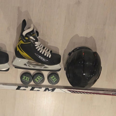 CCM ishockeyutstyr komplett sett bestående av skøyter, hjelm med gitter, hansker, albuebeskyttere, benskinner og beskyttende klær. Utstyret er designet for ishockey og inkluderer flere beskyttelseselementer for sikkerhet under sporten.