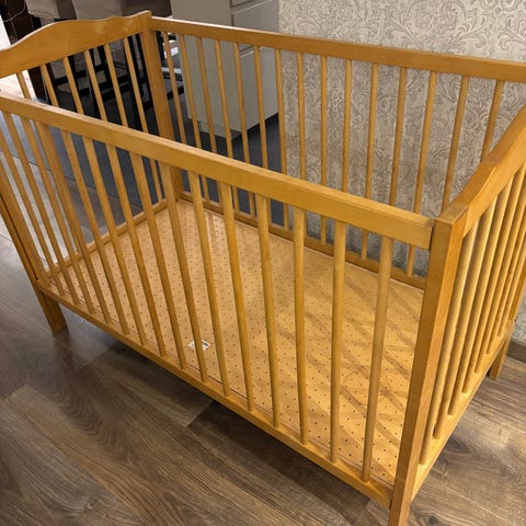 Noen steder falmet maling, men ellers i god stand. Kan justeres i 2 høyder. Madrass og sengekant kan fåes med gratis!