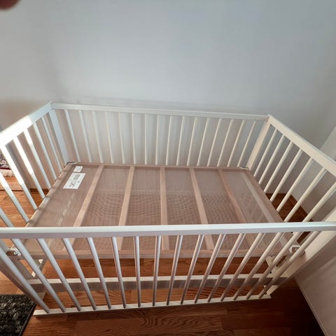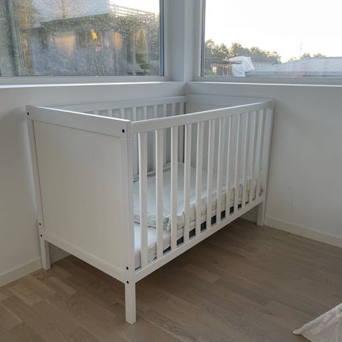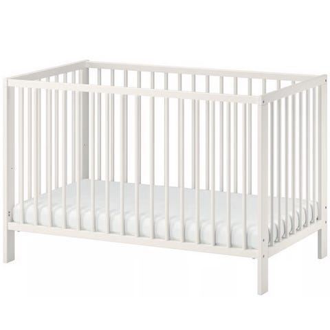 IKEA Sprinkelseng barneseng i hvitt tre. Barnesengen har en enkel design med spiler rundt hele sengen for sikkerhet. Passer for små barn og kan brukes som en trygg soveplass.