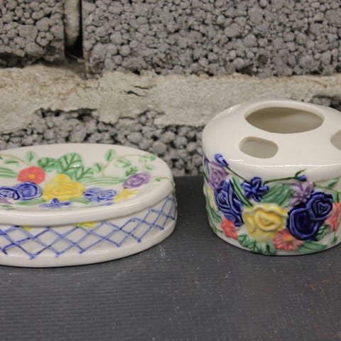 baderomsett porselen såpedispenser tannbørsteholder blå hvit blomster vintage stil romantisk bad cottagecore landlig shabby chic bad interiør keramikk