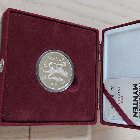 Norsk myntsamling bestående av minnemyntsett plassert i et treskrin. Settet inneholder flere mynter med ulike motiver og årstall. Treskrinet har plass til alle myntene og inkluderer informasjon om myntene i lokket.