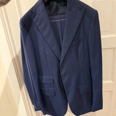 Buksen er skreddersydd hos Suitsupply via deres custom made tjeneste, med str. 50 som utgangspunkt. Derfor passer buksen best til en person som er maks 183 cm og har slanke ben.