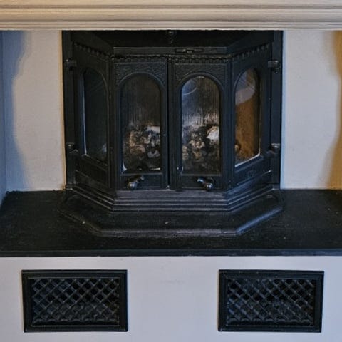 Vedovn i Skifer Stein med glassdør og pipeuttak