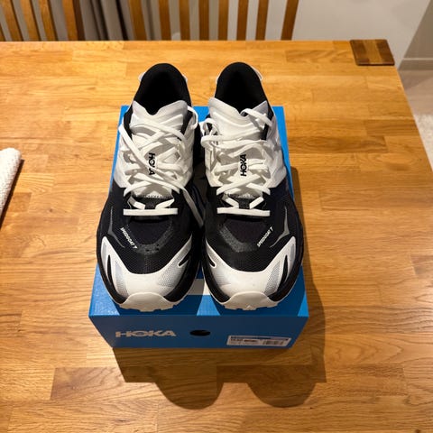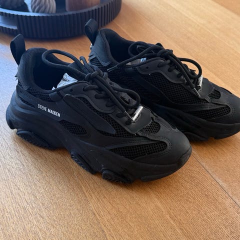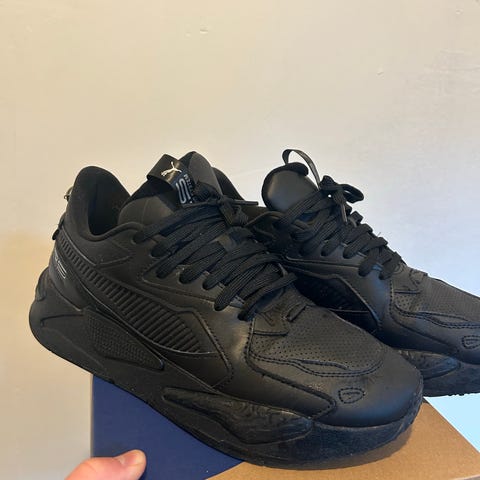 Selger et par svarte Puma-sko i størrelse 43. Skoene er behagelige å gå i og passer godt til både hverdagsbruk og lett trening.