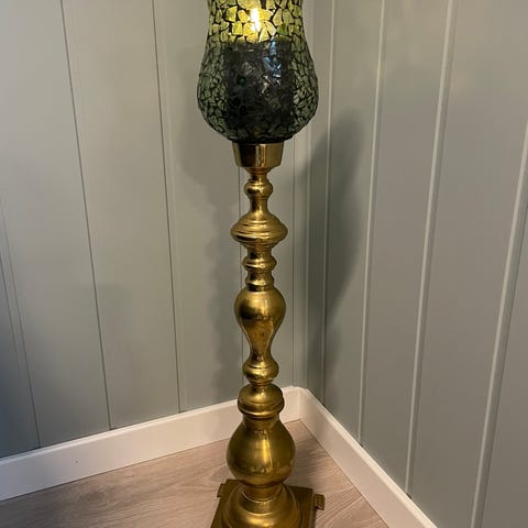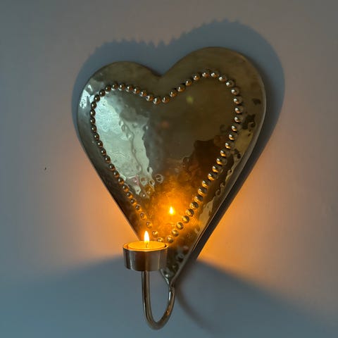 Hjertelykt i gull/metall med heng for telys. Håndlaget med flotte detaljer. H:25 cm B:21 cm. Søkeord: lysestake, messing, klassisk, dekorlys, antikkstil, veggdekor, vegglysestake, vintage, retro, stue, interiør, dekor, dekorasjon,belysning, gull. Kan sende med PostNord for 69kr