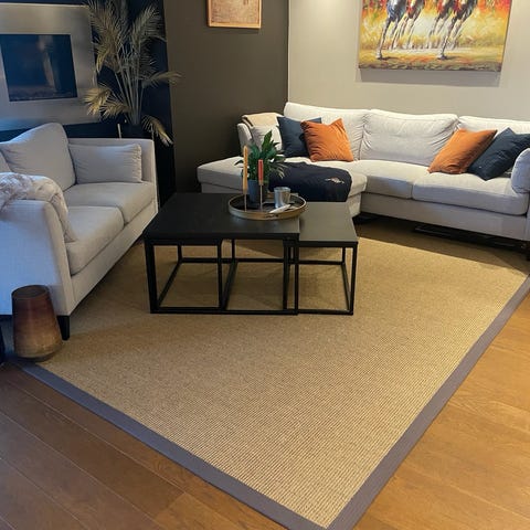 Stort mørkt sisal teppe fra teppeabo til salg. Ny veiledende pris er 1288kr per m2.