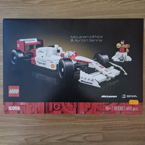 LEGO Icons McLaren MP4/4 & Ayrton Senna byggesett med 693 deler. Settet er designet for voksne byggere og inneholder detaljerte elementer som representerer den ikoniske McLaren Formel 1-bilen og Ayrton Senna. Passer for samlere og entusiaster av motorsport og LEGO.