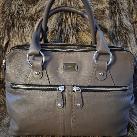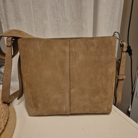 Becksöndergaard veske i semsket skinn. Vesken er i beige/moral gray og inkluderer en justerbar skulderrem. Den har flere lommer innvendig, inkludert glidelåslomme, for oppbevaring av personlige eiendeler.