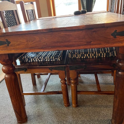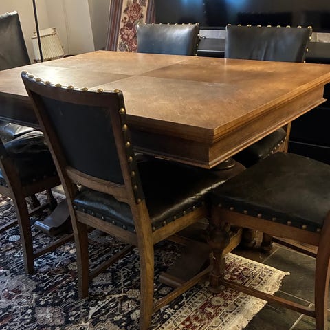 Spisegruppe i god stand. Bordet kan forlenges med 50 sm fra hver side. 4 gode stoler i svart skinn.