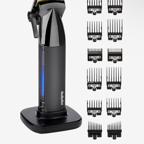 BaByliss Metal Edition hårklipper med metallkropp og flere tilbehørskammer for ulike lengdeinnstillinger. Leveres med ladestasjon og designet for presisjonsklipping.