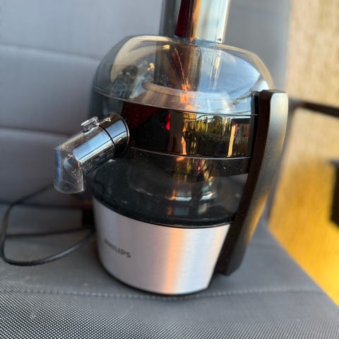 Philips saftpresser laget av hvit plast. Inkluderer avtakbare deler for enkel rengjøring. Designet for å presse juice fra frukt.