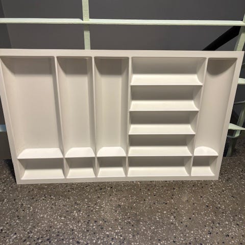 Helt ny bestikkskuff innmat i hvit Kunststoff, ubrukt, ny, uten skader. Målene se bildet. Må hentes, kun Vipps som betaling