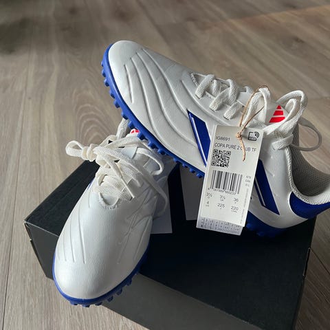 Adidas Copa Pure 2 Club TF J fotballsko i størrelse 36 2/3. Skoene har en hvit overdel med blå detaljer og er designet for bruk på kunstgress (TF - turf).