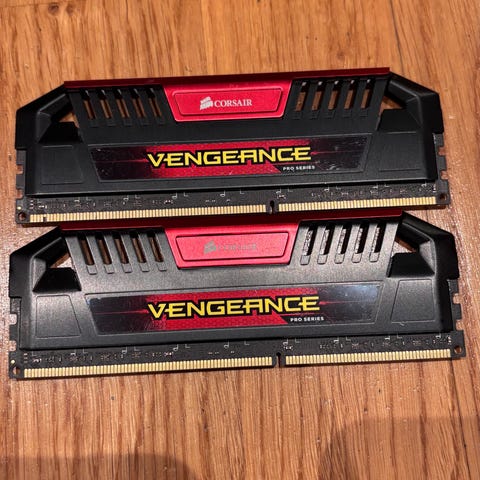 Corsair Vengeance LPX RAM DDR4 med en hastighet på 3200MHz og en kapasitet på totalt 16GB fordelt på to moduler à 8GB. Moduler i svart farge, designet for desktop-bruk med lav profil (LPX).